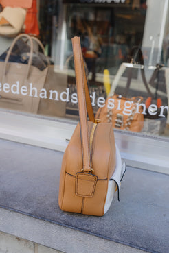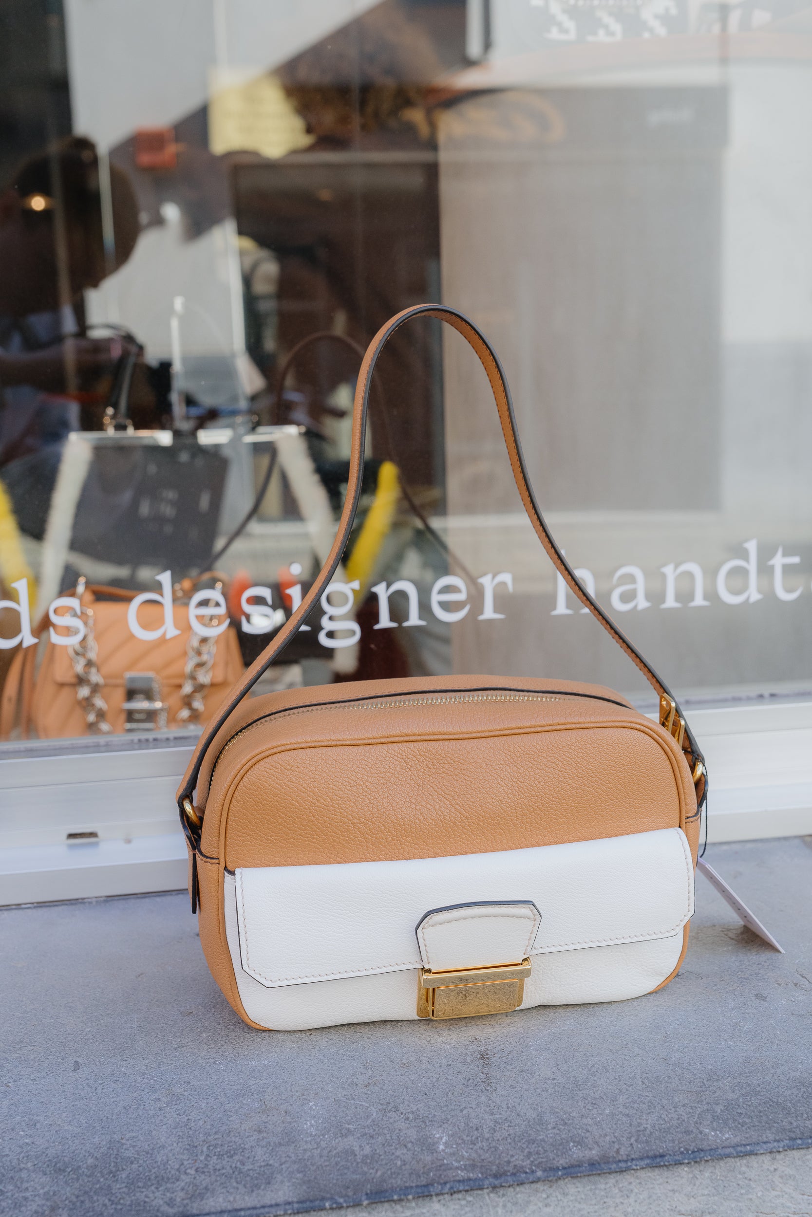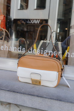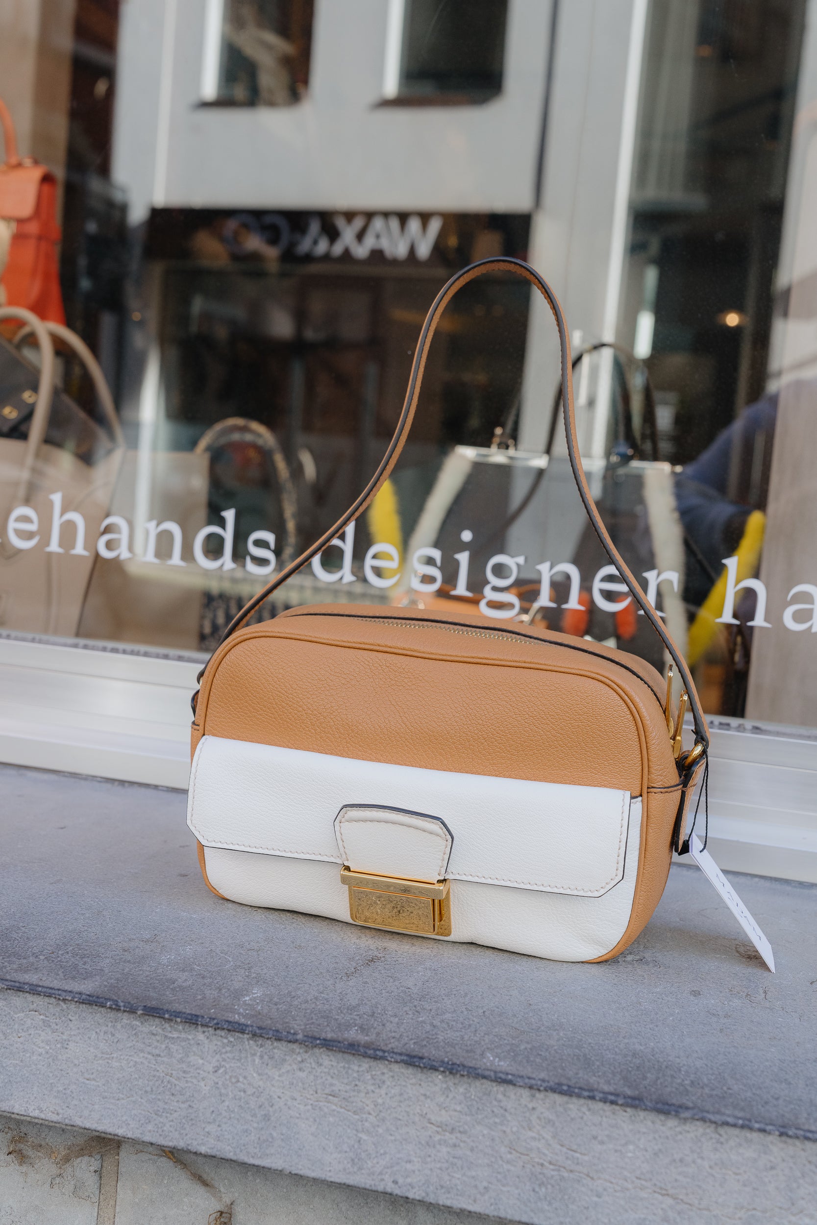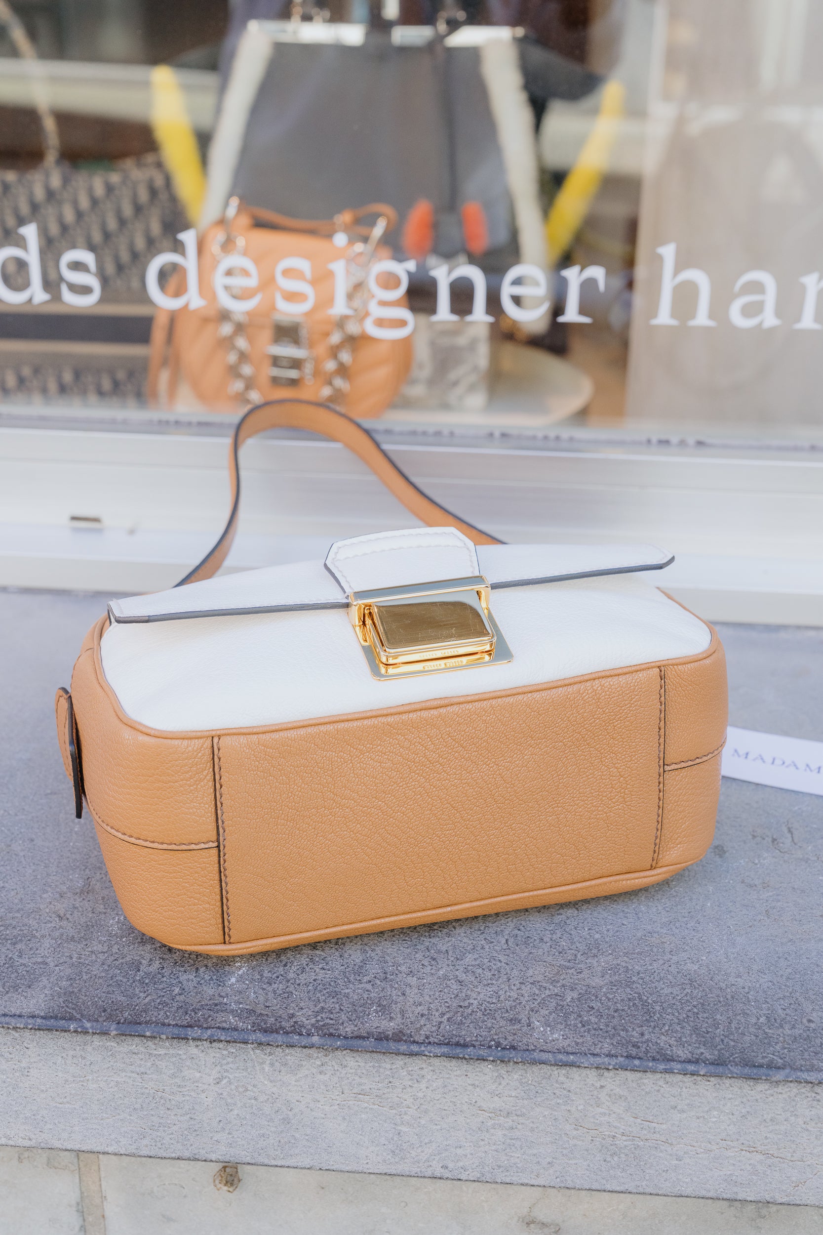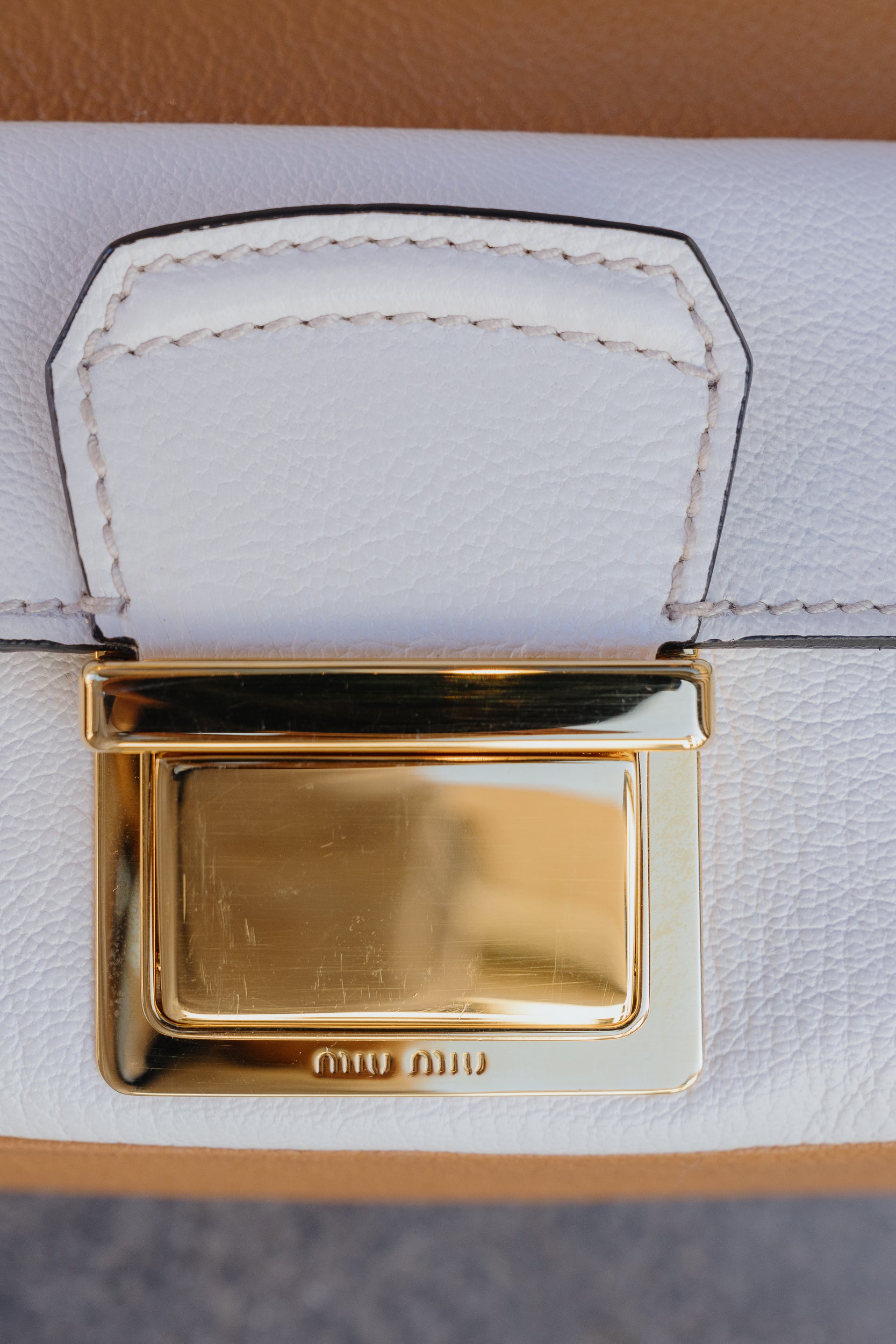 A Miu Miu bicolor top handle bag crafted in beautifully soft leather. The camel and off-white color combination gives it a timeless, refined look. A true little gem. Elegant, versatile, and easy to wear, whether carried by hand or styled more casually.