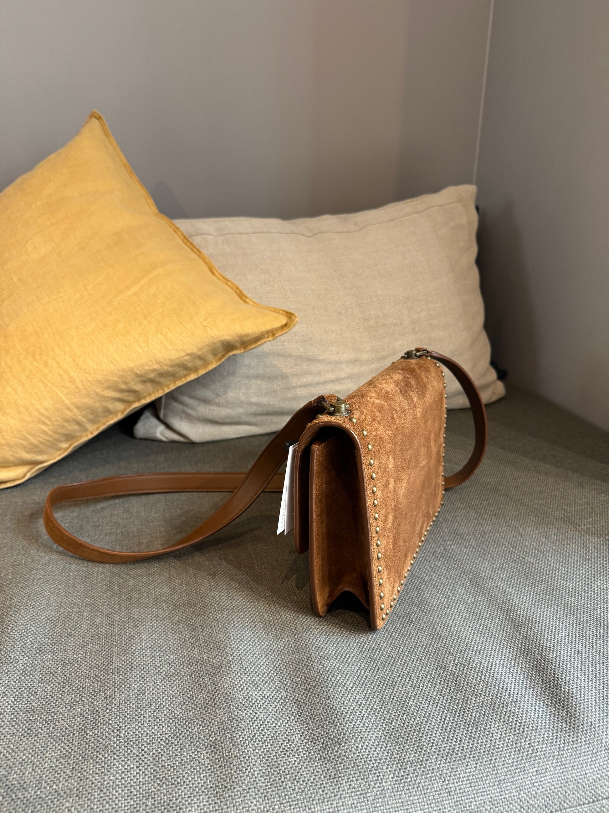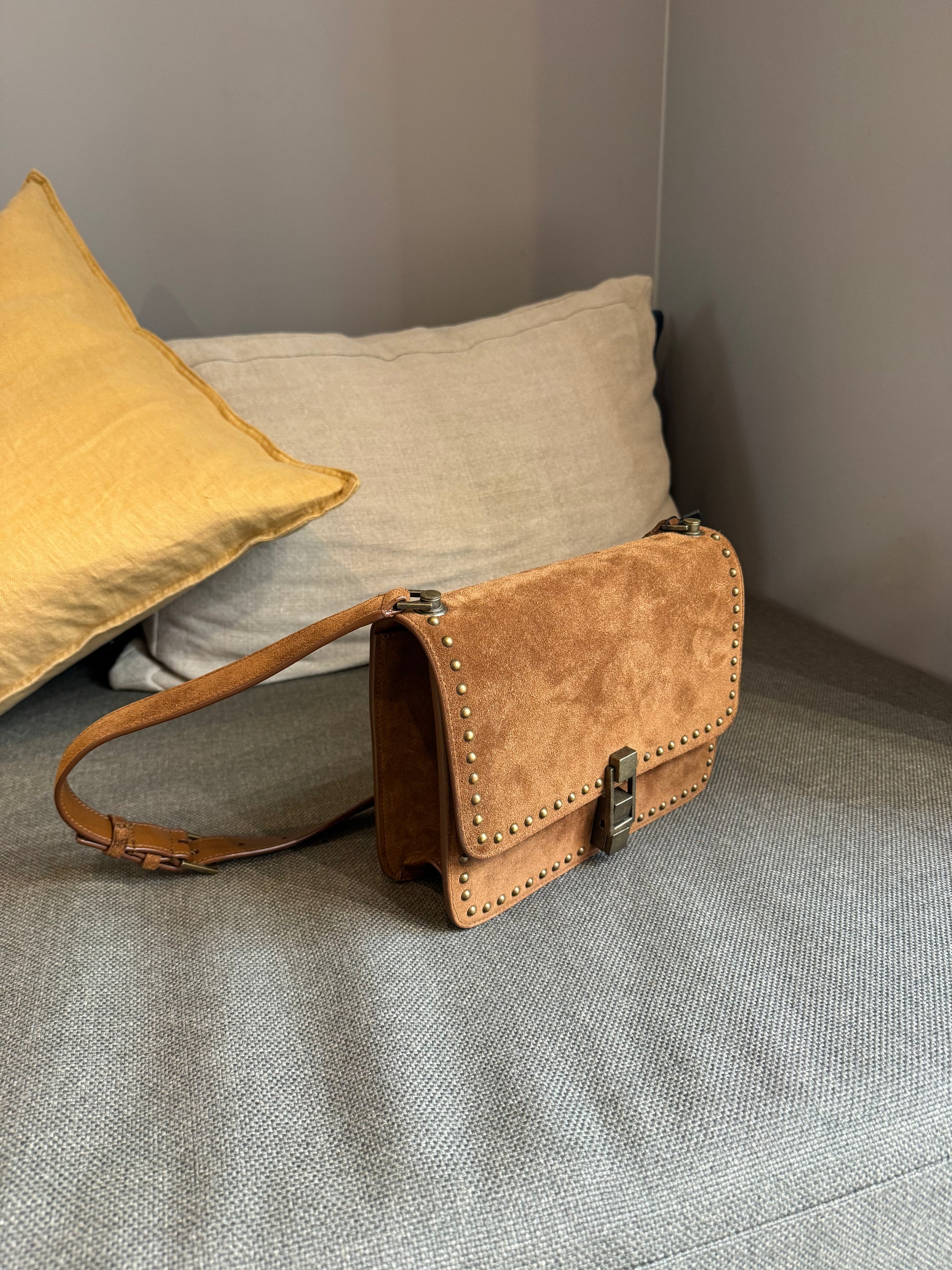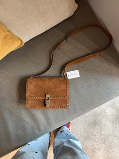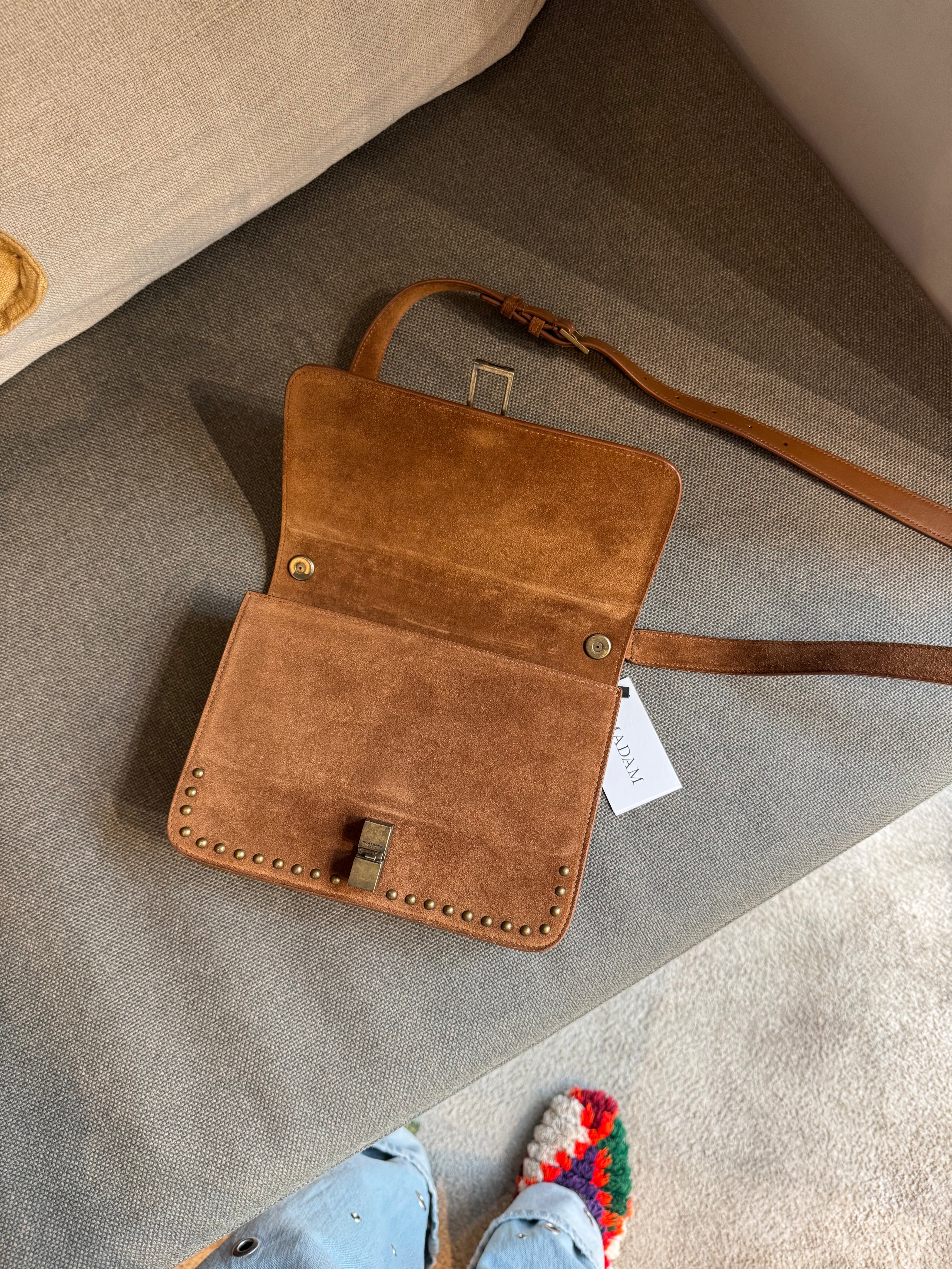 This Saint Laurent Dain studded crossover bag in chestnut brown is in excellent condition. Featuring subtle stud detailing, a sleek silhouette, and a versatile design, it’s ideal for everyday use. Compact yet roomy enough for essentials, this bag combines practicality with understated luxury.