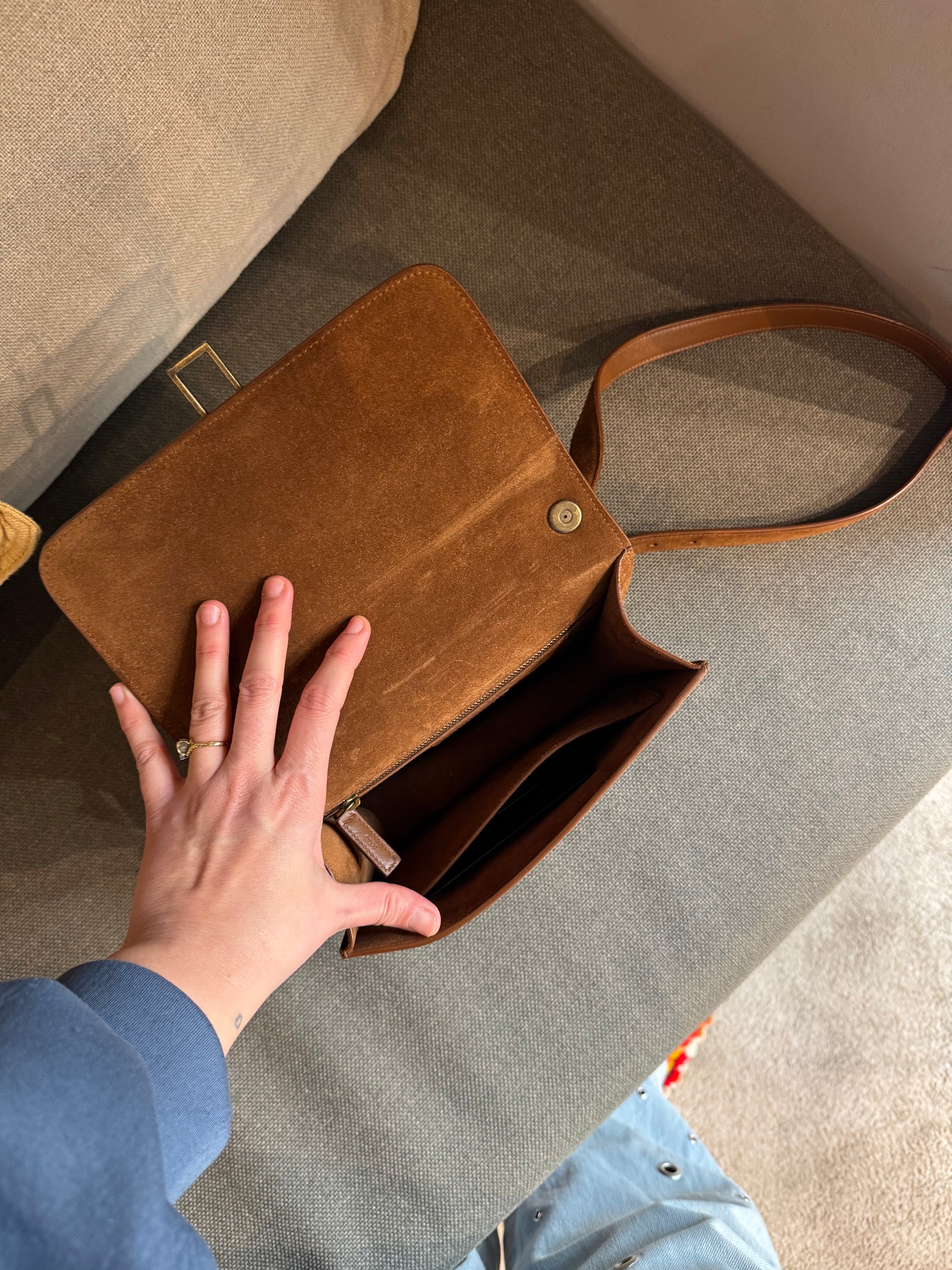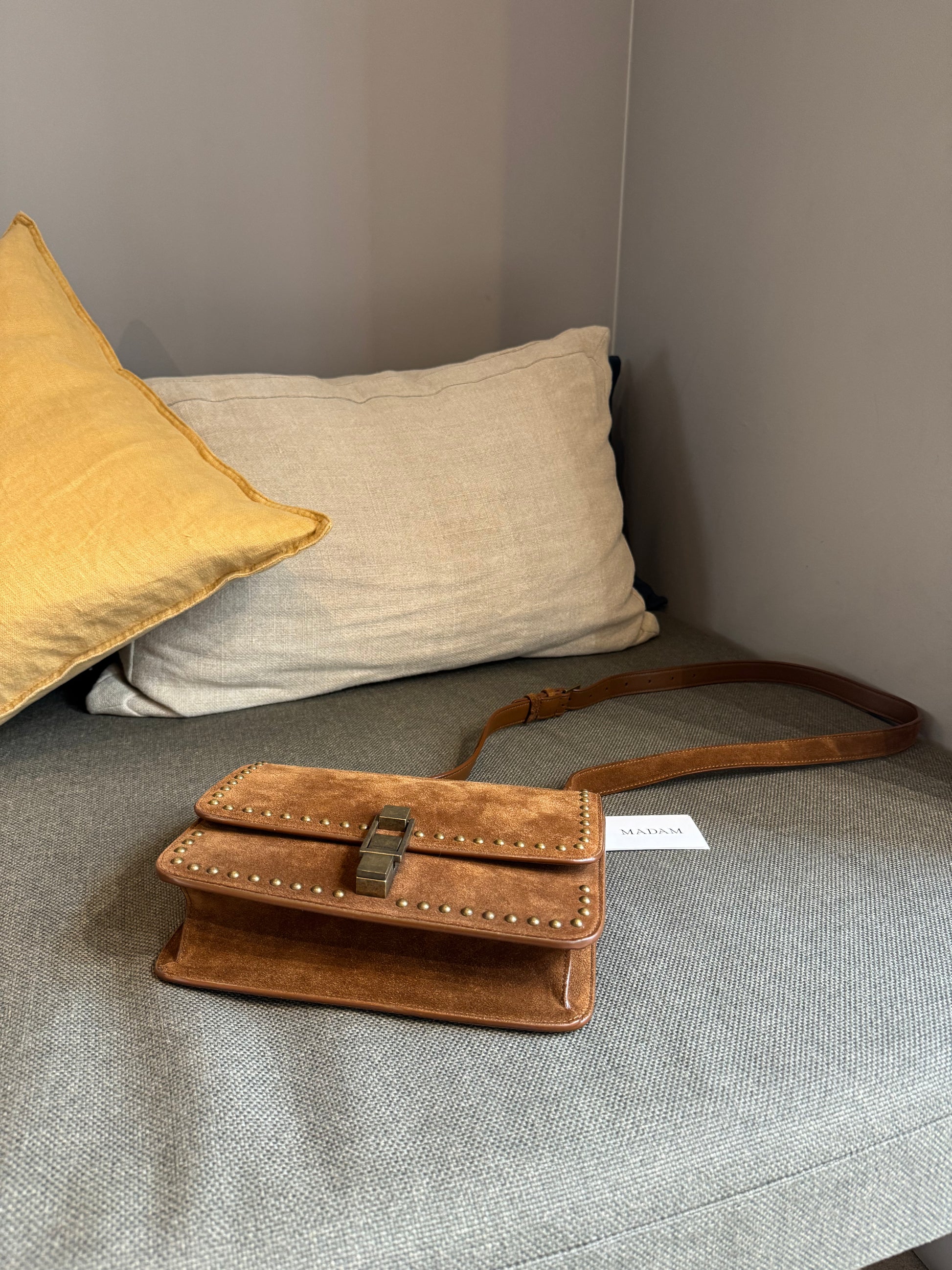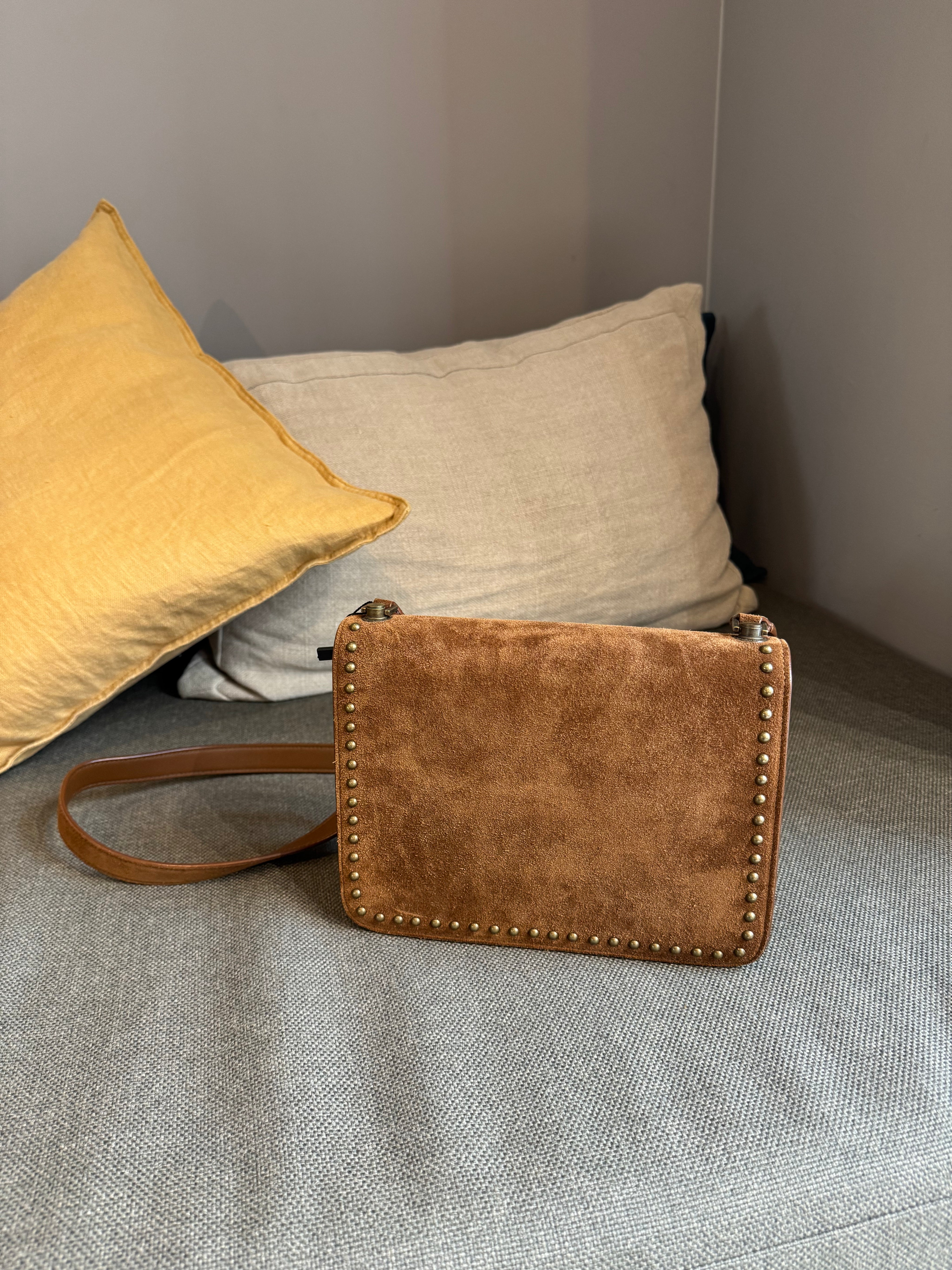 This Saint Laurent Dain studded crossover bag in chestnut brown is in excellent condition. Featuring subtle stud detailing, a sleek silhouette, and a versatile design, it’s ideal for everyday use. Compact yet roomy enough for essentials, this bag combines practicality with understated luxury.